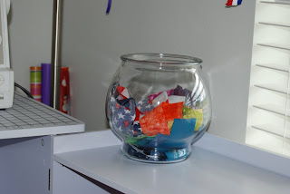 And it is conveniently located next to my sewing machine for easy access, so that I will be encouraged to save all my scraps from now on!