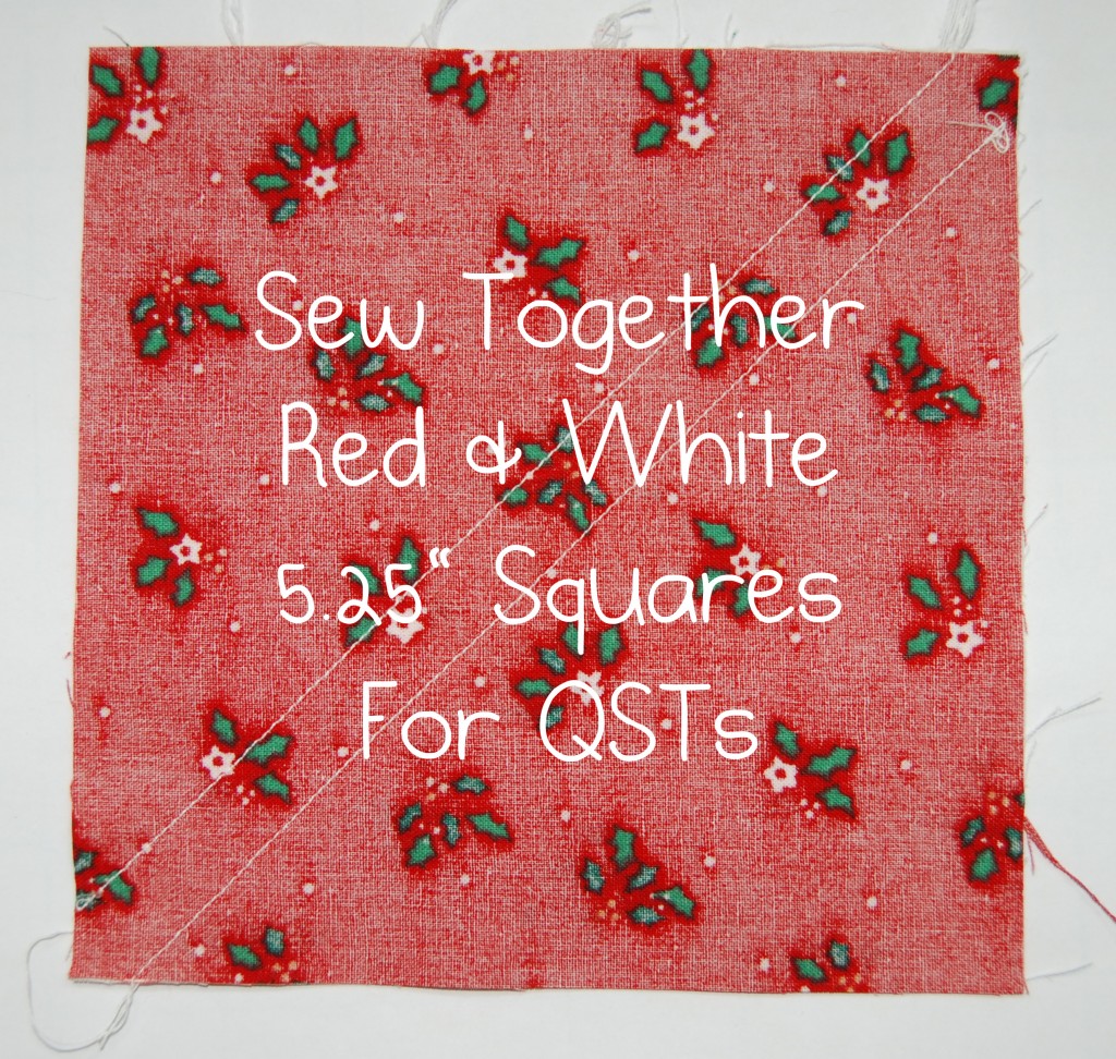 You now have enough triangle to make 2 squares. Repeat with the other red & white 5.25 inch squares.