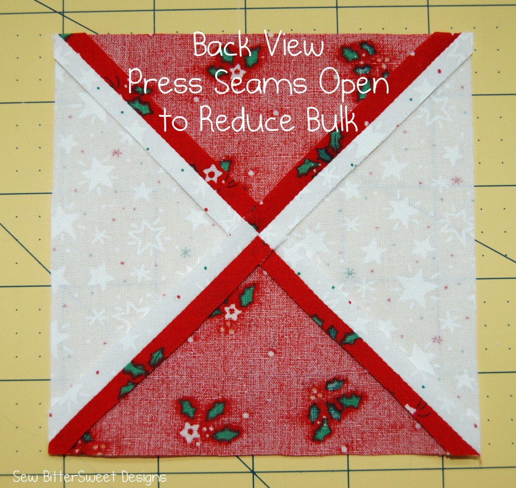 You will want to match your seams, pin and sew the triangle together. You will make four total. I like to press my seams open because it reduces the overall bulk when you go to quilt your project.