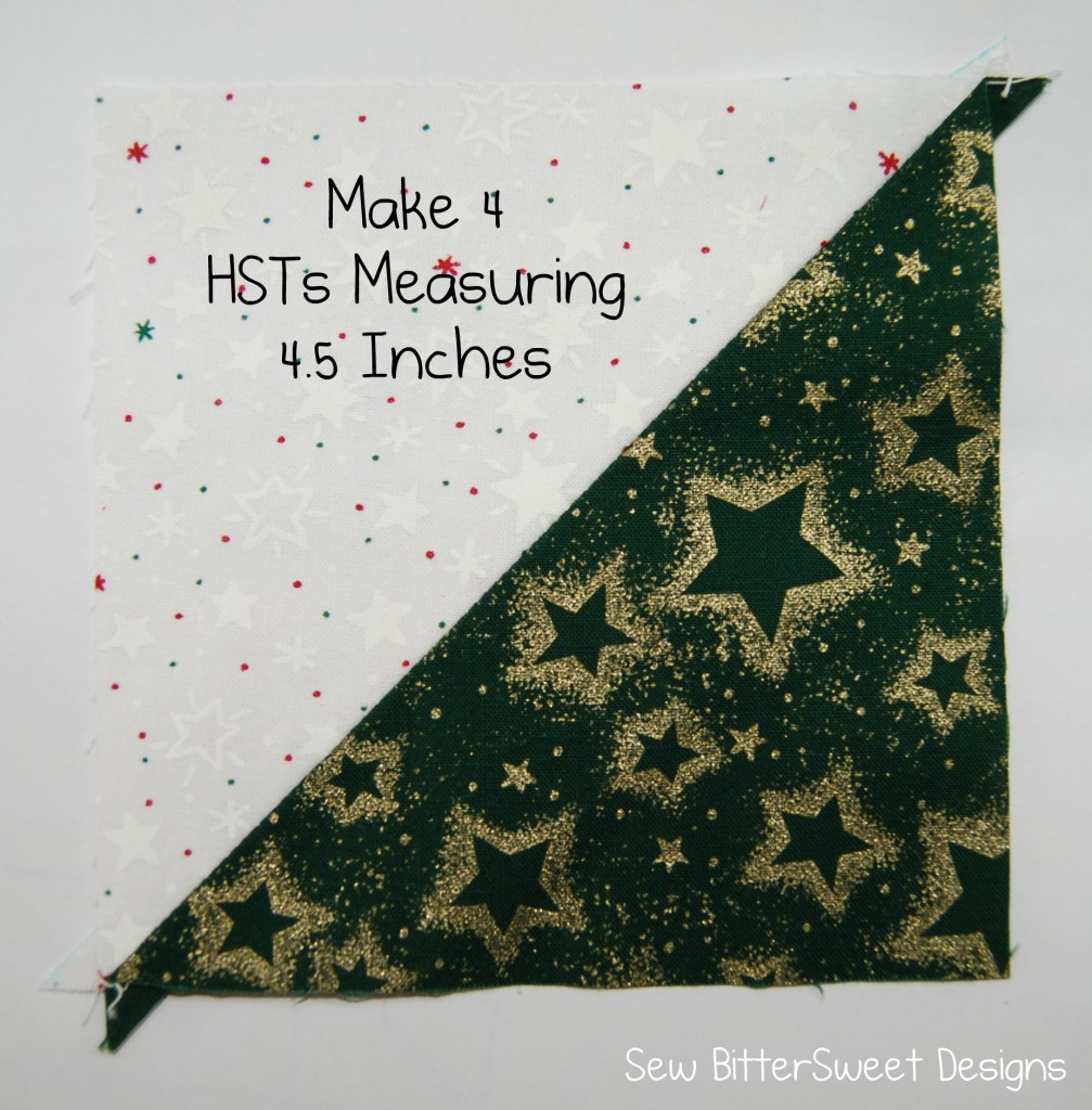 Next, make your half square triangle using the white and green 5″ squares. Using the same method from the QSTs, mark on the white fabric – corner to corner, place white and green fabrics right sides together, and sew 1/4″ on either side of marked line. For Half Square Triangles – you only cut ONE time.