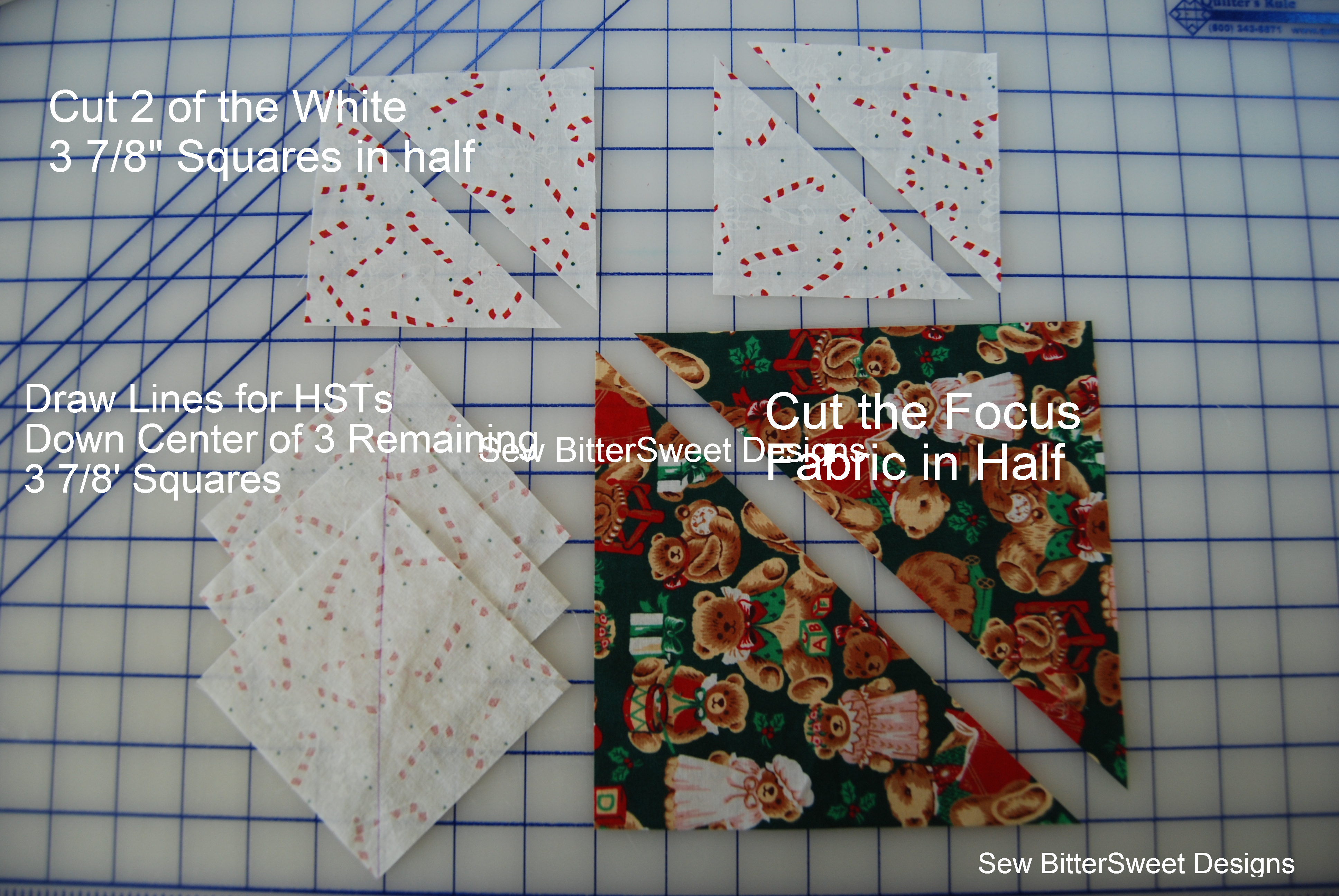Pair the 3 remaining 3 7/8″ white squares with the 2 Red and 1 Green Squares measuring 3 7/8″. Create half square triangles.