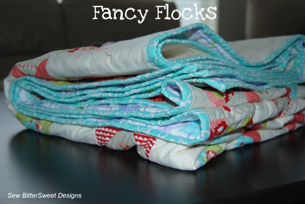 In other big news, I finished Fancy Flocks! This is the first time that I have machine sewn a binding on…sorta. I have done sashing that is somewhat like binding on my Bottled Rainbows Quilt As You Go project. I think it turned out pretty well, there are some mistakes, but it is made with love and in the end that is what should matter most!