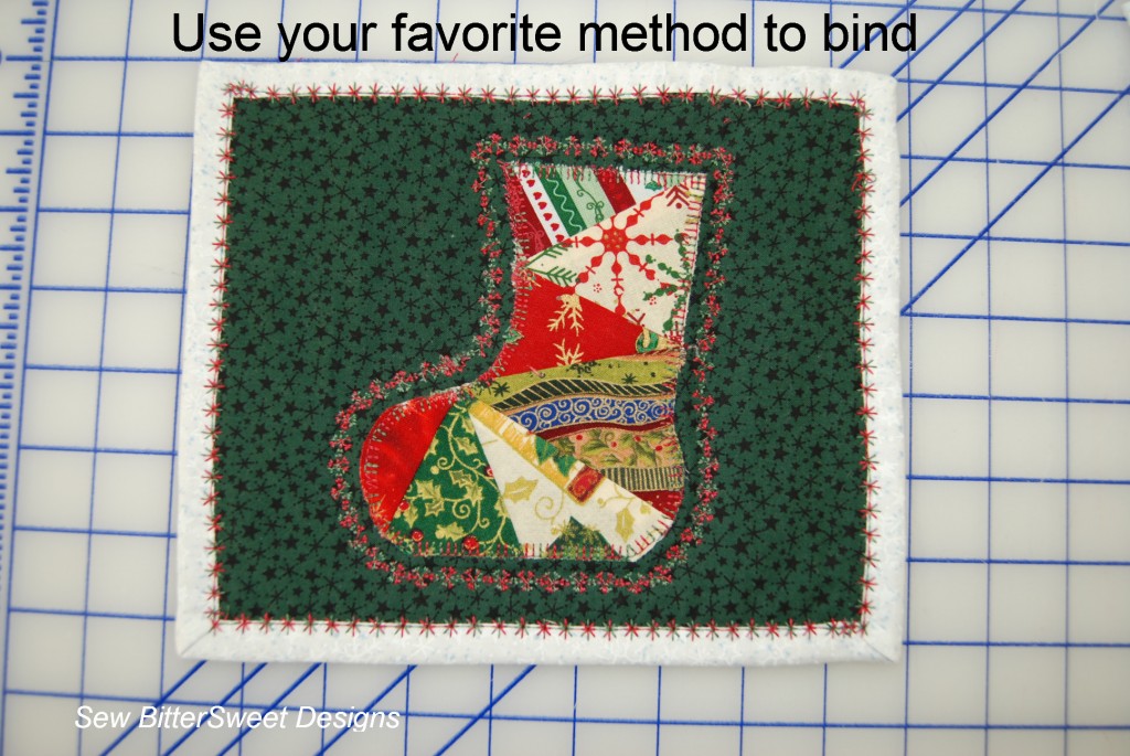 After I had my machine all set up with the ideal conditions suggested by Superior Threads – I got sewing. I started with appliqueing the stockings down, and I was really impressed with the thread, not a single break and the tension on the back was perfect.