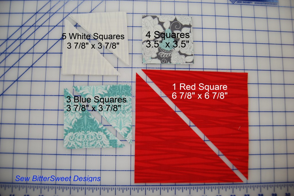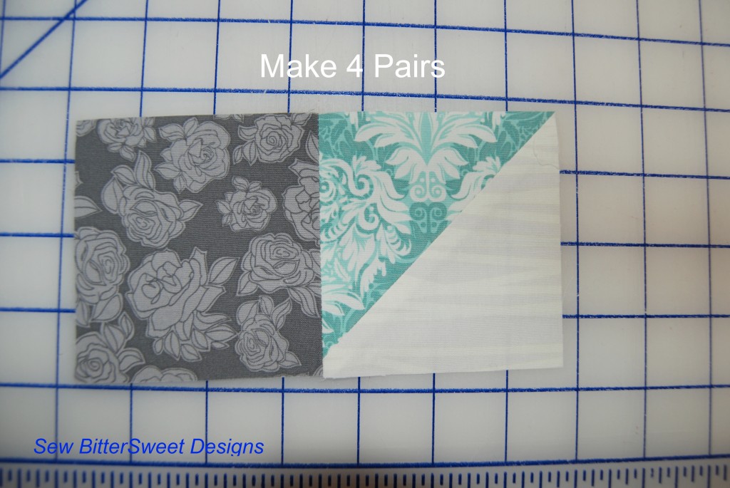 Usually when I make HSTs I cut my squares larger, but for this block, I find my results are more accurate if I cut to these measurements and starch like crazy.