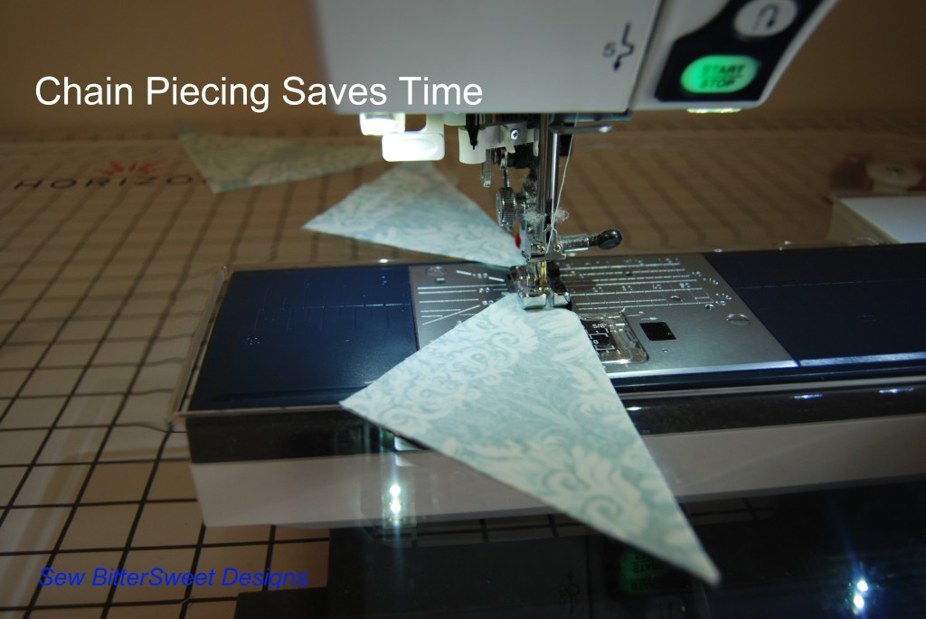 Start by Assembling your 6 blue & white HSTs – I like to chain piece. Sew section after section without cutting your threads until you are done.Then cut them all apart – for newer quilters – this will save you lots of time.