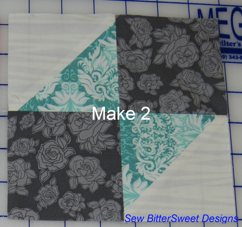 Next – take 2 of your HSTs and assemble your large triangle sections (make 2):