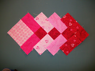 1. Along the short side sew a red 2.5″ square to a dark pink 8.5″ x 2.5″ strip. repeat with another dark pink strip. Do the same with 2 of each of the other colors (light pink, white and red). Press the dark pink pieces towards the dark pink and the rest towards the 2.5″ red square.