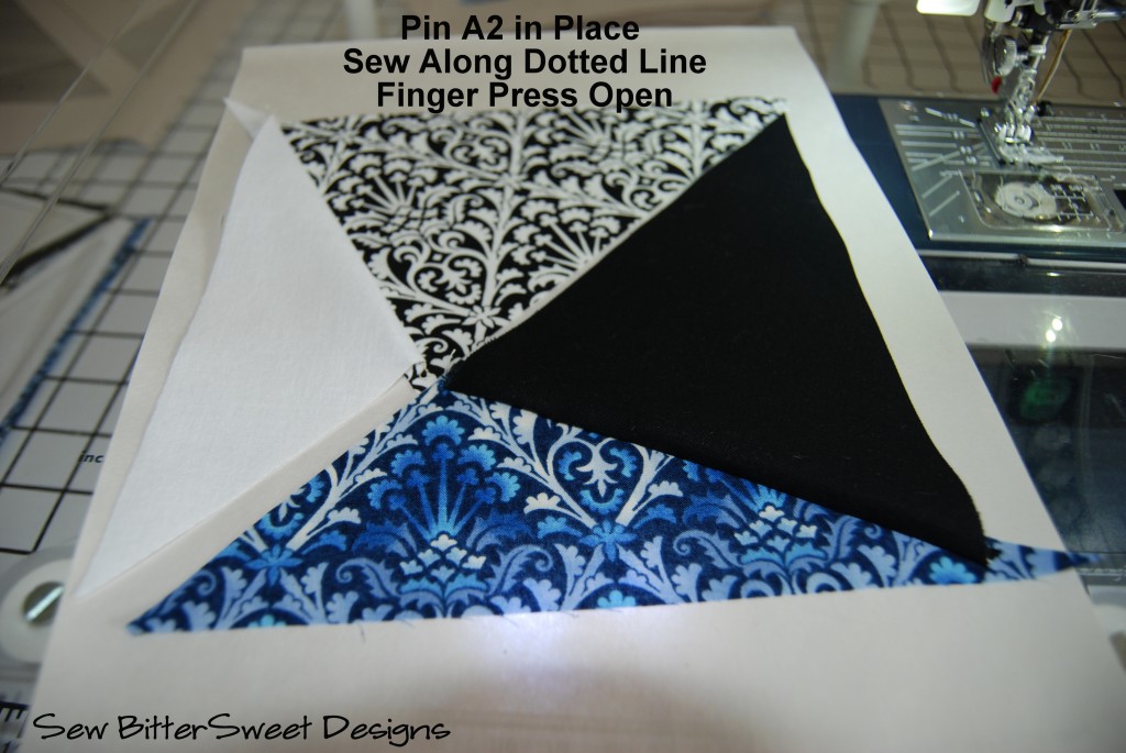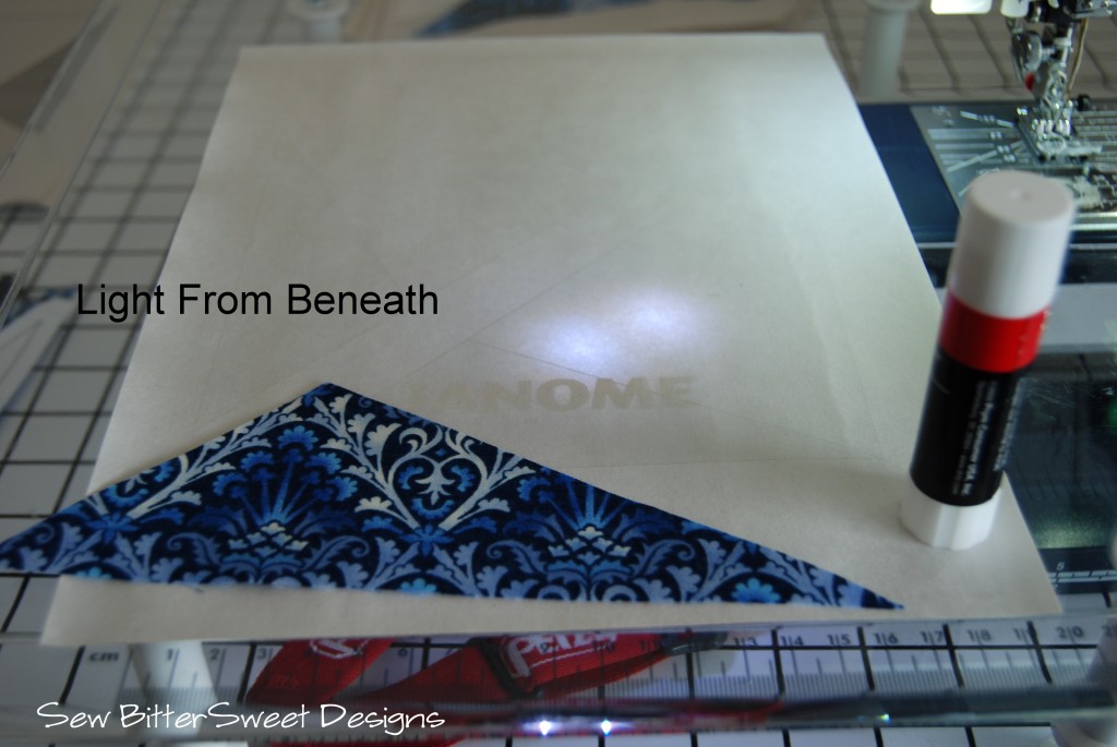 If you have a clear plastic sewing table – like the one that came standard with my machine, I recommend putting a light underneath it – this will help you arrange your pieces to be perfectly in line with your paper piecing template.
