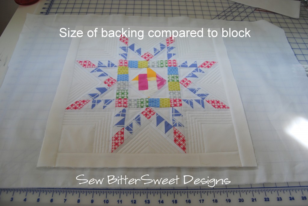 Step 6: Trim backing down to same size as quilt block – make sure you OPEN the zipper!!!