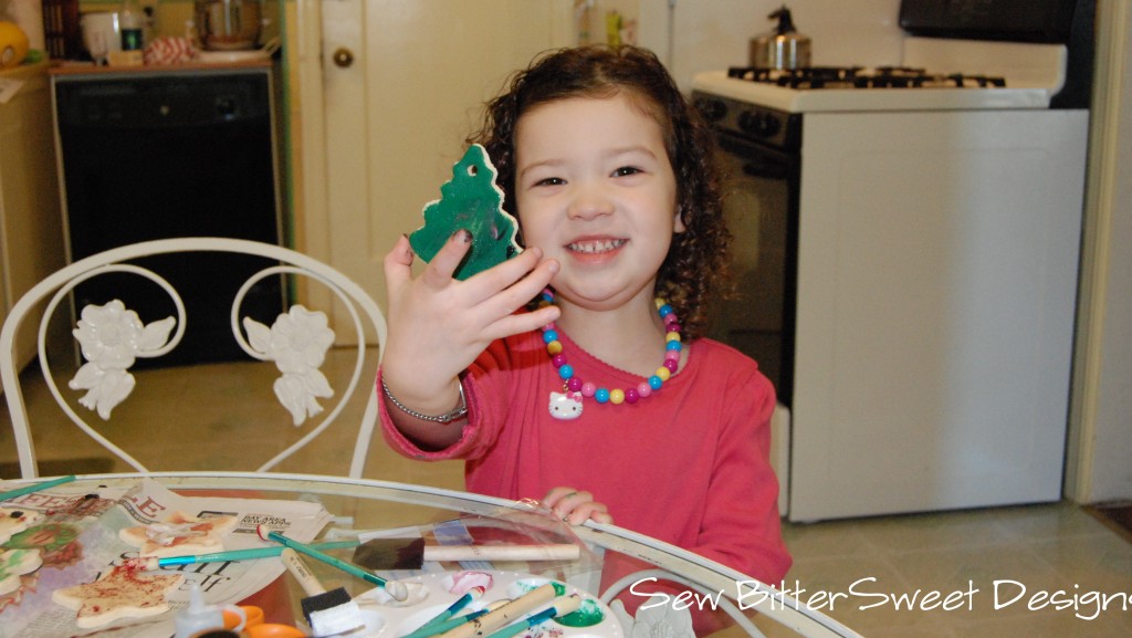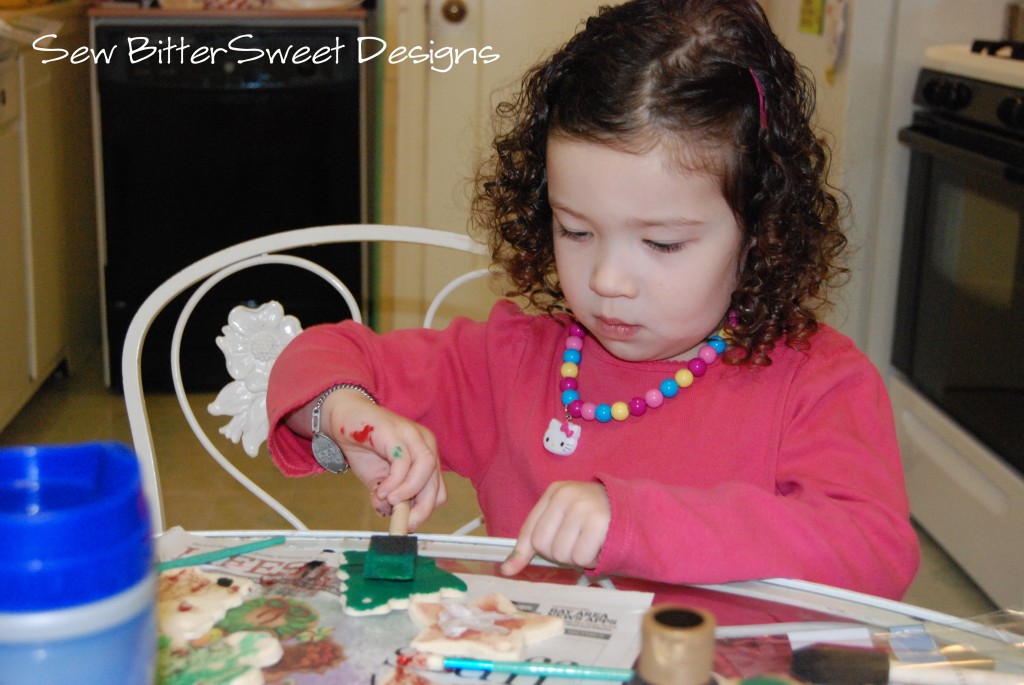 I haven’t done much sewing since I have been on vacation, some, but not much…I’ve bound 2 quilts and made 3 blankets, I still have 2 blankets left to go, but hey I have 9 more days before those need to be finished, that’s tons of time! I have, however, been doing a ton of Christmas crafting with Anne! Here are some pictures from our fun and messy adventures.